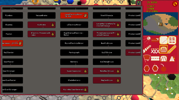 In Red Trains, research progresses automatically without your input. The People's Republic never stands still. You can, however, affect the direction of research and make requests for particular areas to be investigated. Research unlocks components for train design, increases production, and even enable new types of rail tracks.