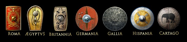 Rome, Aegyptus, Britannia, Germania, Gallia, Hispania, and Carthago.