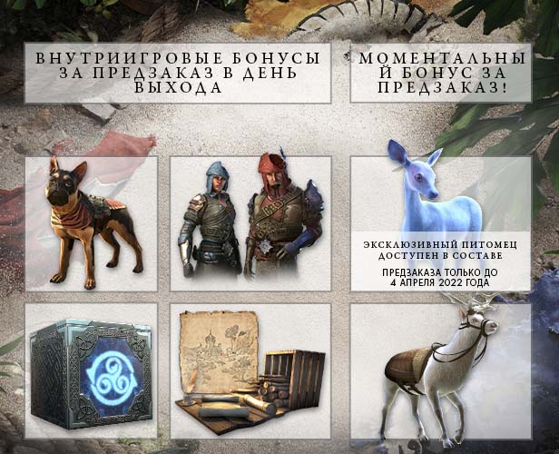 Оформите предзаказ, начните приключение в базовой игре или в одной из предыдущих глав и сразу получите верховое животное — морозно-серебристого оленя, питомца — морозно-серебристого олененка*, а также уникальные предметы после выхода новой главы: