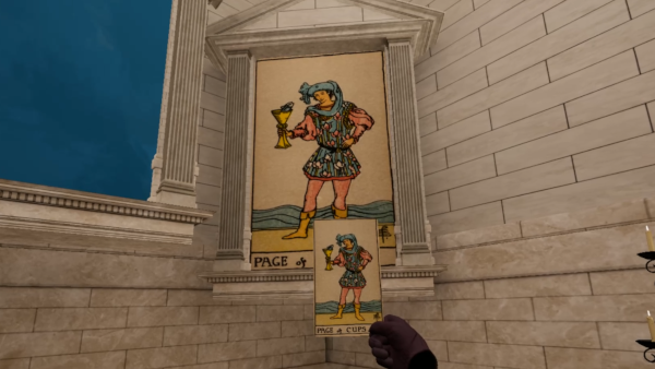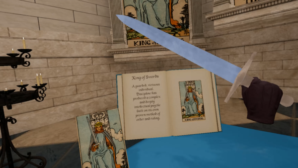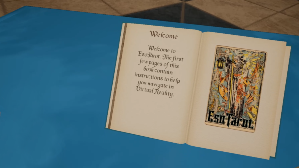 Immerse yourself in our environments by interacting with several items. A physical tool representing each of the four suits of the Rider-Waite tarot is included in each environment of EsoTarot. You will find an interactable Sword, Wand, Cup and Pentacle. Other items are also included such as large portraits and candles. The most important of these items being the Book of Tarot titled "EsoTarot The Great and Sacred Arcanum"The Book of Tarot - EsoTarot The Great and Sacred Arcanum