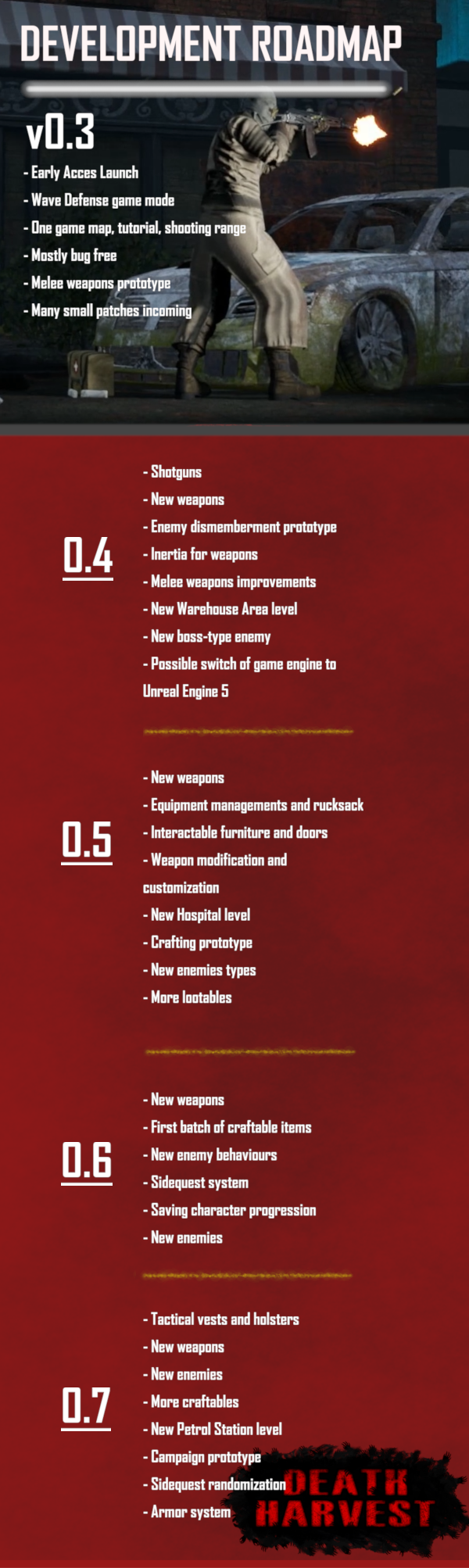 Несмотря на то, что мы - небольшая студия энтузиастов, работающих над игрой после работы, мы решили, что выпустим воспроизводимую и полную версию продукта независимо от показателей продаж. Дополнительный контент можно будет создавать и добавлять в игру только при вашей поддержке. Мы надеемся, что вам понравится играть в Death Harvest. Дайте нам знать, что вам нравится или не нравится на нашем сервере Discord.