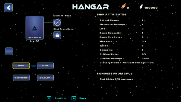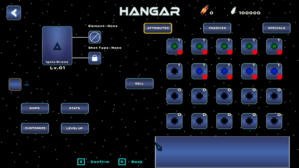 Чтобы разблокировать более поздний класс, игроку необходимо полностью обновить предыдущий класс. В ангаре можно повысить уровень корабля с помощью кристаллов, которые собираются путем уничтожения врагов. Кроме того, у каждого корабля есть пассив, который позволяет создавать различные типы сборок.
