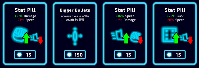 - Таблетка характеристик: принимайте ее, если хотите добавить или удалить значения к некоторым характеристикам, таким образом изменяя игровой процесс по своему усмотрению.