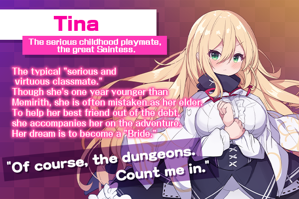 Embarks on an adventure with her best friend "Tina" to find the treasure hidden in the depth of dungeons.
