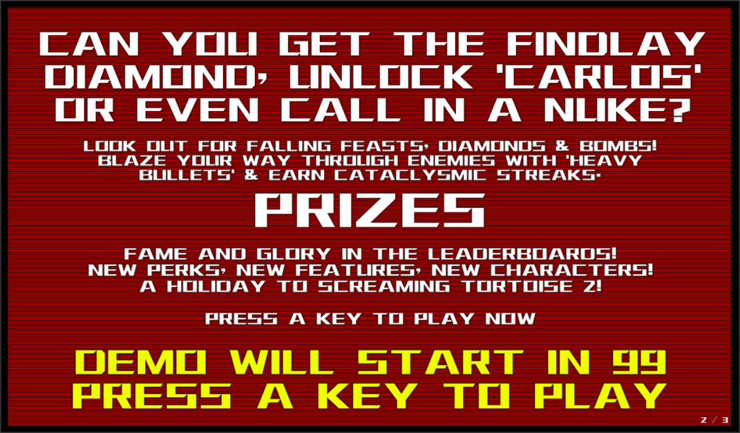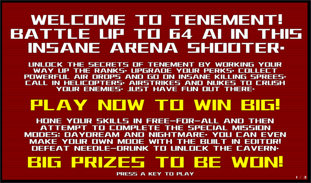 Tenement is inspired by the likes of Modern Warfare online mixed with old style 2D platform games of the 90s and the configurability and replayability of Worms. Also thrown into the mix are SmashTV and The Running Man. With a healthy dose of humour as well as inspiration from movies, religion and gameshows it is sure to raise a few eyebrows.