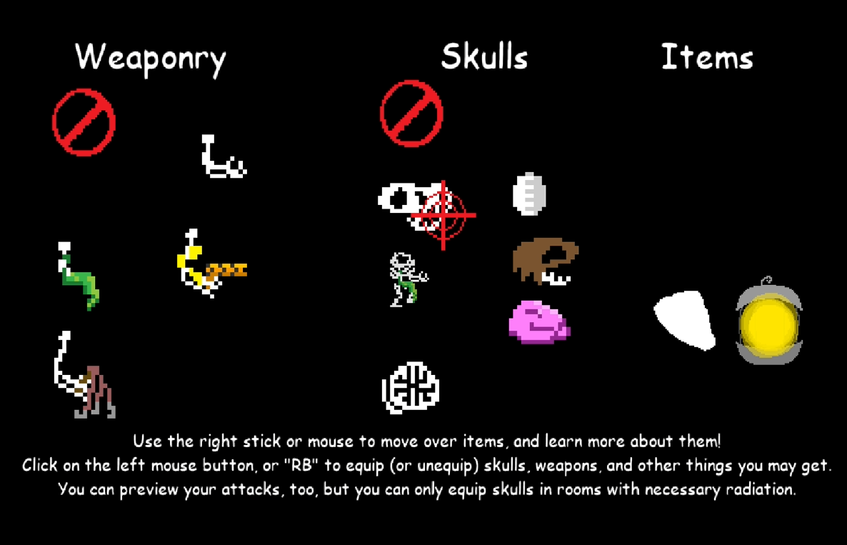 You control the skeleton as he rebuilds his body with weaponized limbs and powerful skulls. More powerful weaponry often requires the completion of side quests, from a multitude of NPCs, to acquire items. Skulls are gotten by hunting the very powerful bosses, and after defeating them, you can wear their heads as your own! These give you a multitude of unique powers, changing your playstyle and helping you beat the 13 unique bosses (including 4 mini-bosses), each with their own unique theme song!