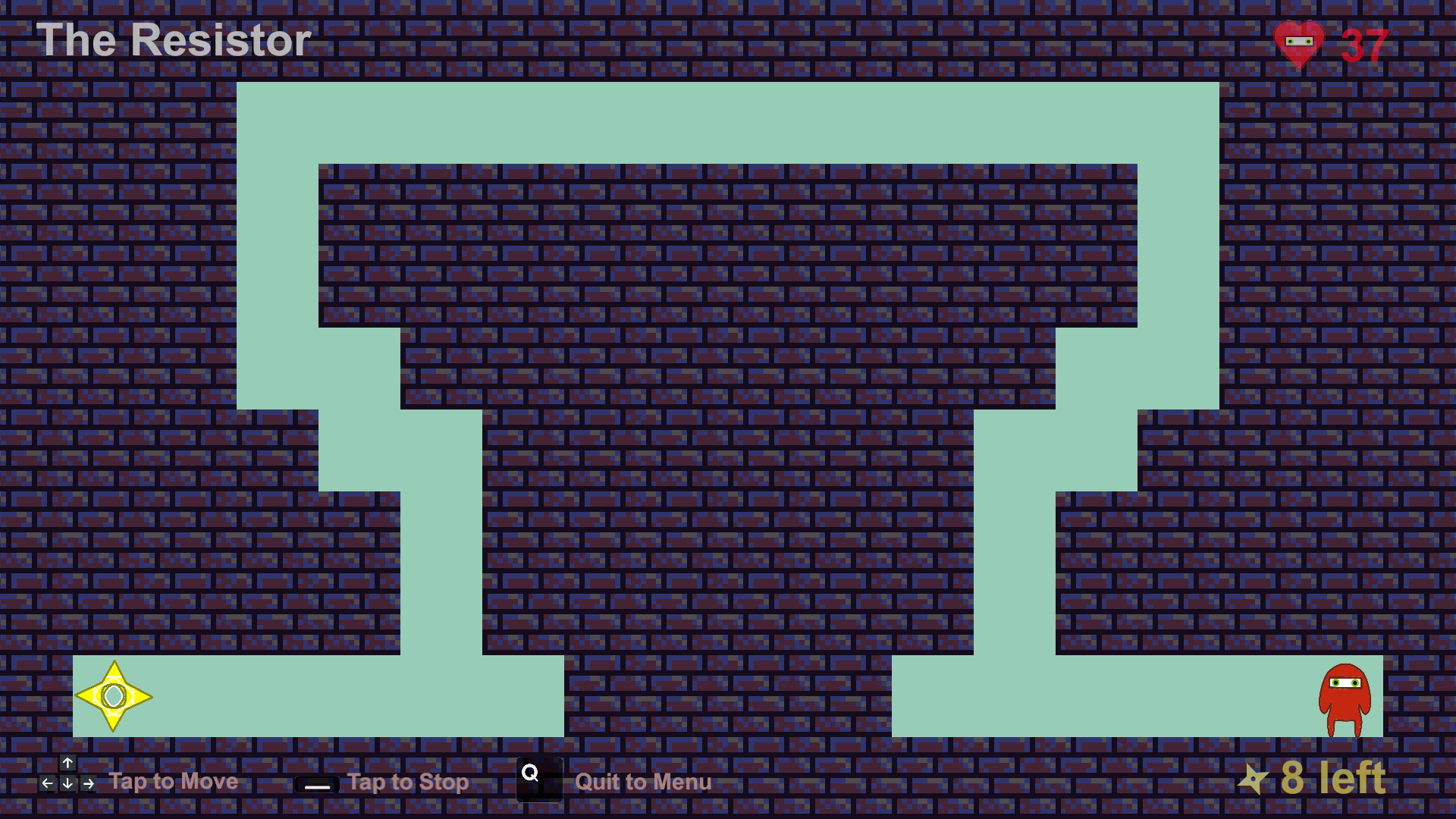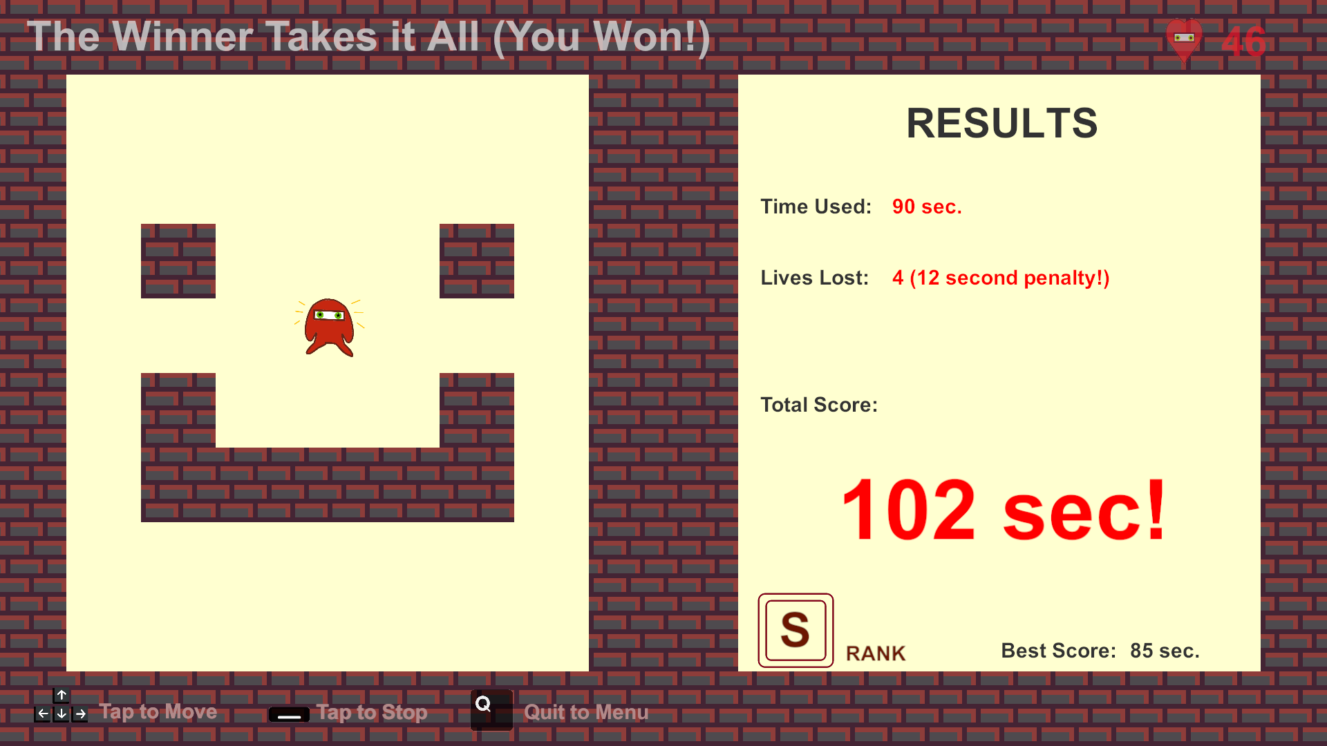 The goal of the game is to escape as fast as possible, with as many of your fifty lives as possible. Successfully avoiding taking damage from walls, and non-friendly objects will limit the accrual of penalty time. Your only friends here are your gold shurikens (...that are strictly props). Reclaim fifteen of those "prized collectors' items" to win the game!