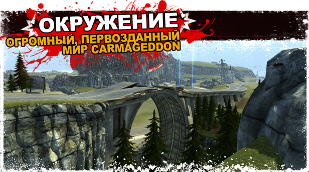 Новые локации и сочетание лучших уголков многочисленных пейзажей, которые мы так любили уничтожать в Carmageddon. Уровни "Блик-Сити", "Каньон дьявола", "Пыльные тропы", "МагНюХем" и "Снега" возвращаются в обновленном виде, однако там по-прежнему можно найти такие незабвенные достопримечательности, как мертвые петли, кислотные ямы и футбольный стадион. Эти локации — просто апогей сюрреализма! Мы даже умудрились вписать в один из уровней огромный миксер!