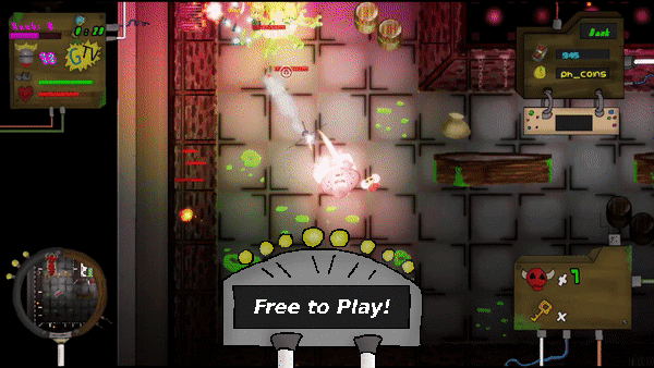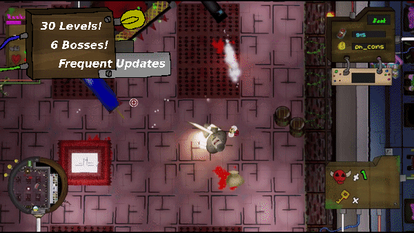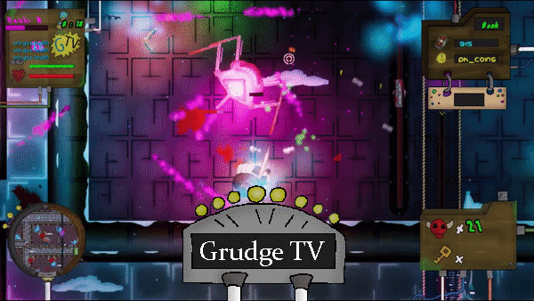 Grudge TV is a top down, bullet hell game that pits the player against hordes of genetically altered demons on a gladiatorial game-show on the planet Paragon. You play as Vuinten, a hero who's been thrown into the games because he murdered a religious leader. As you fight your way through the games, trying to defend yourself and expose the evil Alt religion for what it is, you'll be able to unlock numerous armors, bullets, aimers, and slashes.