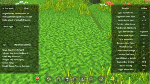 Craftica can provide instant help and hint that is relevant to the current state of the game and the player. Such help and hint can be turned on or off with the H key at any time. Instant help and hint is automatically turned on when a new world is started, unless it is disabled in the game options.