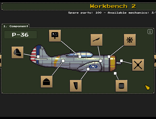 Летательные компоненты для самолетов. Выберите компонент и назначьте больше механики, чтобы сократить время строительства. Никогда не покидайте склад без запчастей.