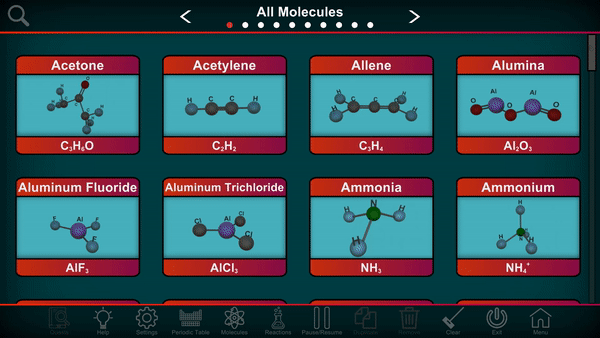Choose one out of 150 molecules, view how its bonds are shaped and positioned. Conduct reactions at any scale!