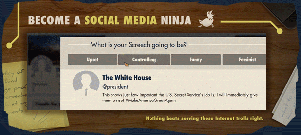 Use the most well-known social media platform - Screecher. Screech about your plans, attitude, call somebody names or maybe praise the voters. It is entirely up to you how you want to come across in the internet – as funny, empathetic, factual or maybe weird? Being the president you have a will and a power to create your own image and write schreeches to your liking. But remember - there are always going to be responses from other users. Prepare for a public backlash!