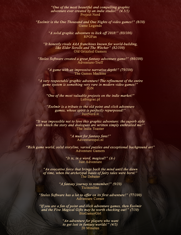 Eselmir and the five magical gifts is a 2D point and click adventure game inspired by the old classics of the genre. It tells the story of Eselmir and his journey to find the five magical lost gifts of King Theoson, leading the player to explore an imaginary world studied in every detail. An atypical and elegant fantasy made up of stories within the story, one enclosed in the other.Story