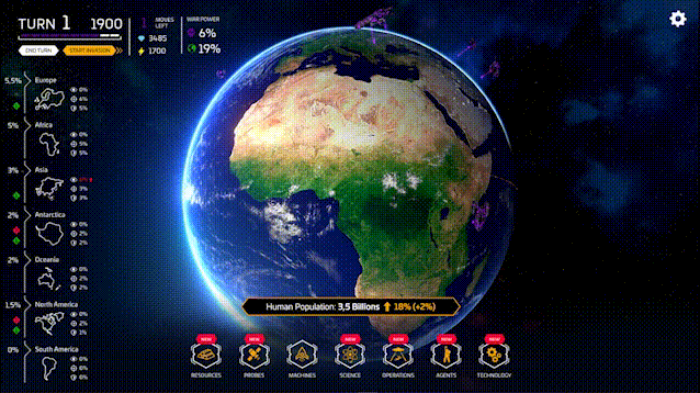 Under Domain accompanies human history from the 1900s until the year of 2020. The player has 10 movements each turn, and each movement represents one year of human existence, completing one decade at the end of each turn. Your actions must be accurate to avoid drawing the attention of humans. After all, possible alien spaceship sightings could reveal your existence to human Nations, and they can get ready to attack you first, increasing the difficulty level of the invasion phase.