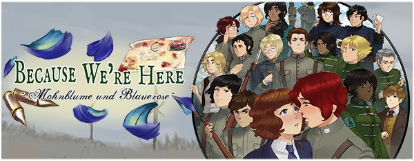 Because We’re Here ~Mohnblume und Blauerose~ is a story-driven otome dating sim in an unforgiving First World War-inspired conflict. It's an episodic visual novel in four acts.