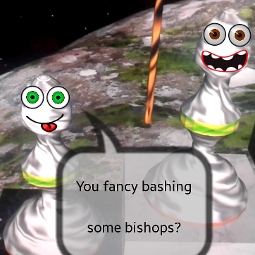 To build a straight line of board squares using your selected Rook, just point at where the final board square of your intended path would be, and press LMB to build it. Or you can use two Rooks, one on each opposite corner of an enclosed rectangle of board squares (maximum size 32x32), to fill the inner area with board squares, by pointing at where any of those squares would be. Rooks can build only once per move, and as the squares magically fall from the night sky, they might randomly "pop-up" goodies from out of Kingland. Building board will also mark your territory, with silver or gold squares. These cannot be used by your opponent's pieces, except in the case of a Knight performing a double move.