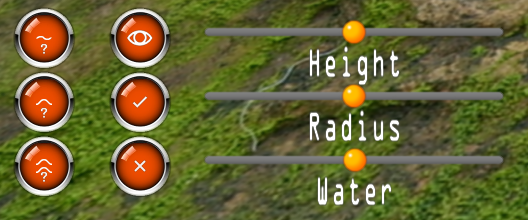 Next are three sliders: hill Height and Radius, and Water height. First two define the hill size as used by the Show and Apply buttons. Height ranges from - through zero to +, Radius is 1 upwards. Water, obvious.