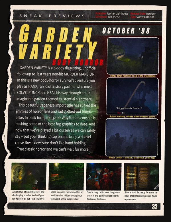 GARDEN VARIETY BODY HORROR is the bloody disgusting, unsanctioned followup to last years sleeper non-hit PROTOTYPE MANSION. In this all new survival/adventure you play as HANK, the idiot B-story partner who must SOLVE, PUNCH and HEAL his way through an unimaginable garden-themed existential nightmare. Investigate a fog filled estate, solve puzzles, fight horrific monsters, and enjoy the relaxing sounds of bad Japanese dub. (English subtitles included)