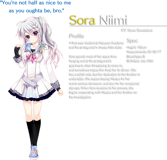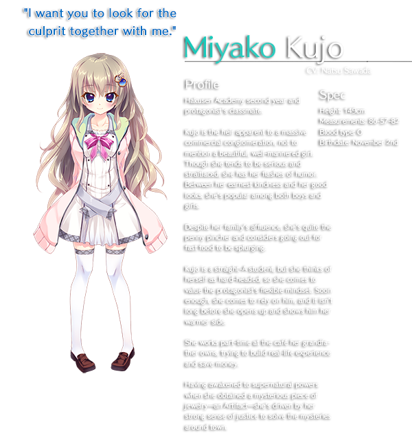 9-nine- Episode 1 is the first volume in a series of supernatural mystery games, with Episode 1 telling a story centered around Miyako Kujo. The entries in the the 9-nine- series share the same setting and world, but each entry focuses on a different heroine. 9-nine- is a tale of the town of Shiromitsugawa, host to mysterious Artifacts and the superpowers they bestow on their Users. A tale of growing trust and budding romance between the protagonist and the heroine, and also a murder mystery where they hunt down the culprit behind a series of supernatural murders. Each game has an independent story that can be enjoyed on its own. We hope you enjoy the experience that is the 9-nine- series.