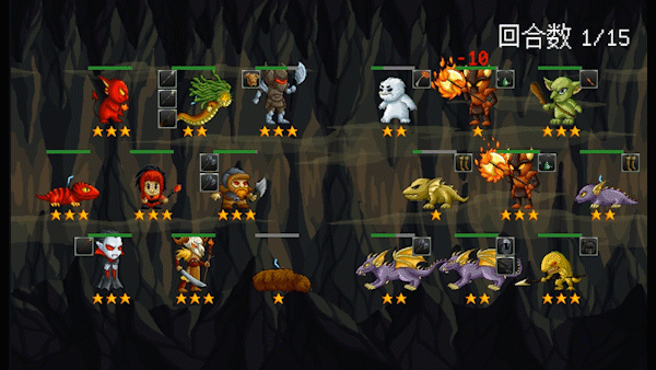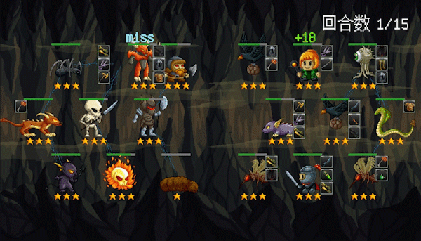 战斗采用类自走棋玩法规则,怪物具有不同的属性、技能、职业等。三个或六个不同的同职业角色同时上阵并连接成为阵营,可触发该阵营特有的职业技能。